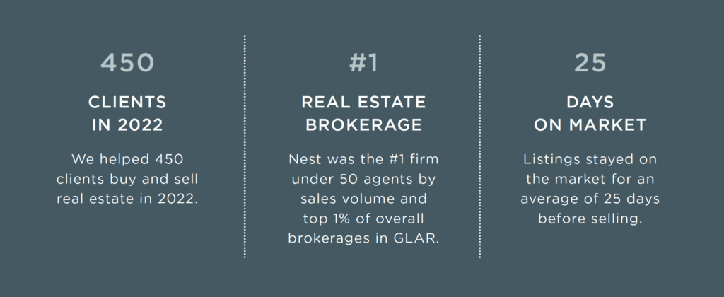 –Our mission at Nest Realty Greater Louisville is to inspire a positive and lasting impact with our agents, clients, and the real estate industry. At Nest, we are all about intentional and strategic growth. As of 2022, we have 451 Nest agents buying and selling throughout 23 offices in 17 locations, spanning seven states across the U.S. With each new office that opens, we are able to expand our reach, better serving you, our incredible clients.