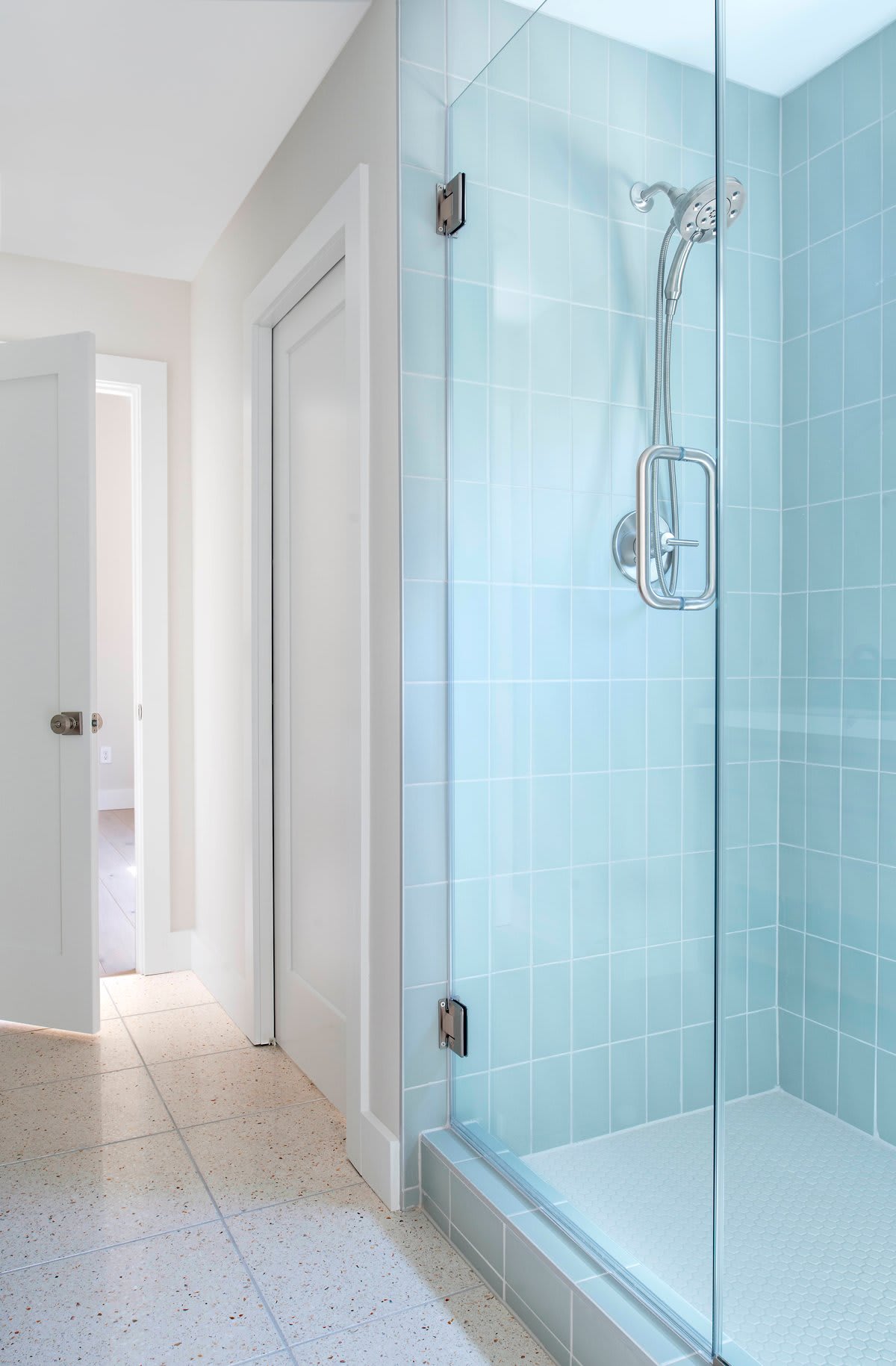 The kid’s bathroom is a Jack and Jill with bedrooms flanking either side. The fun was turned up a bit with colorful terrazzo tiles on the floor that have flecks of blues, greens, and reds. Sage green tiles envelop the shower and peek behind the vanity. The single pendant overhead brings a funky element... “fun and modern but not too over the top or ornate.”